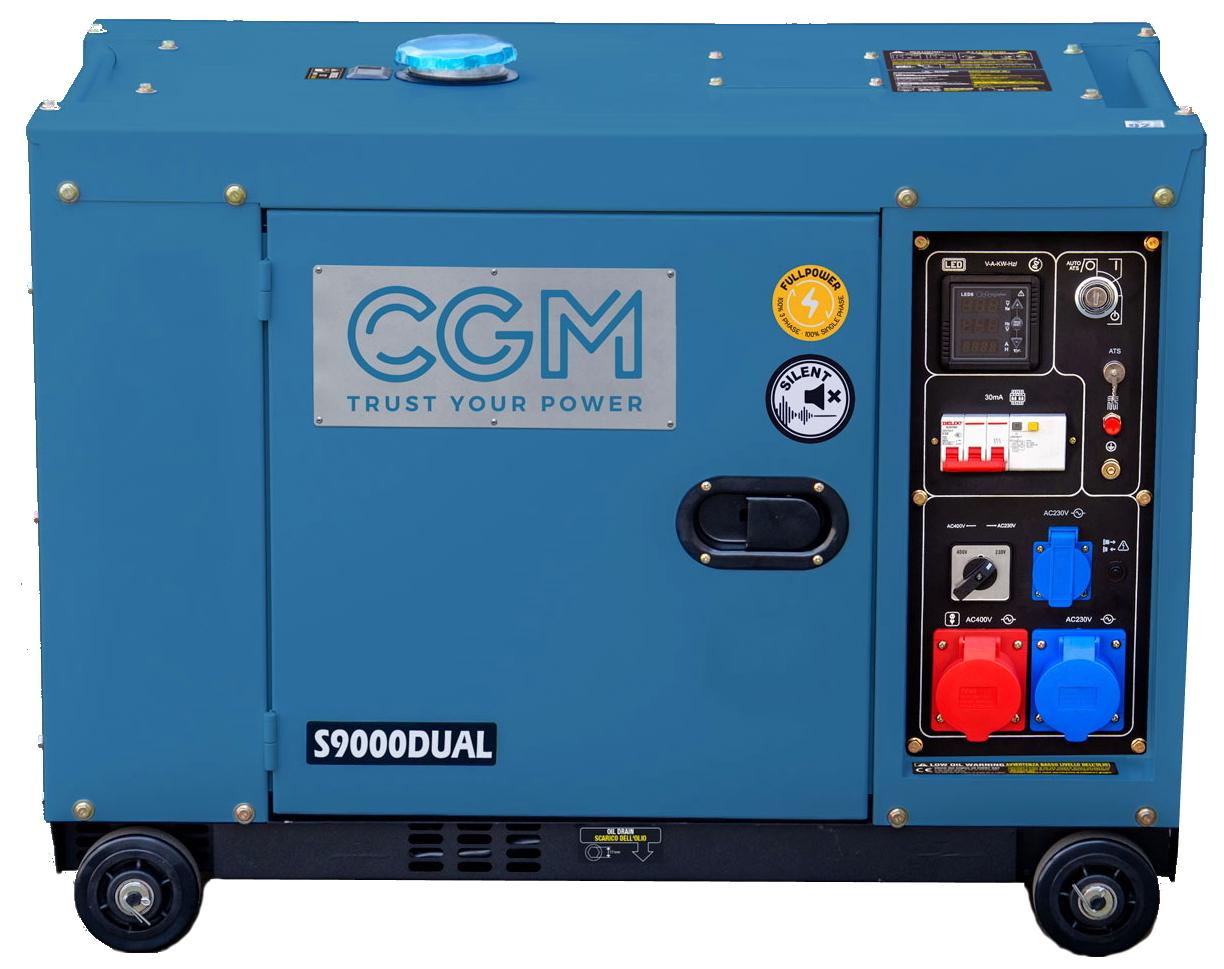 CGM 12 Hp, EU Stage V, 3000 rpm, 3-vaiheinen, max. teho 9 kVA / 7,2 kW, 400 V / 50 Hz, 70 dB/ 7m. Varustelu: 14 l polttoainesäiliö, naru- ja sähkökäynnistys, öljyvahti, 1 x schuko 16A pistorasia, 1 x ECC pistorasia 32A 3-nap. , 1 x 16A 5-nap., elektroninen jännitteensäädin, lämpösuoja, tuntimittari, liitäntä automaattiselle verkonvaihtokytkimelle, ääni- ja sääsuojattu kotelo pyörillä ja työntö/vetokahvalla. Mitat: (pxlxk) 920x520x720 mm, 162 kg