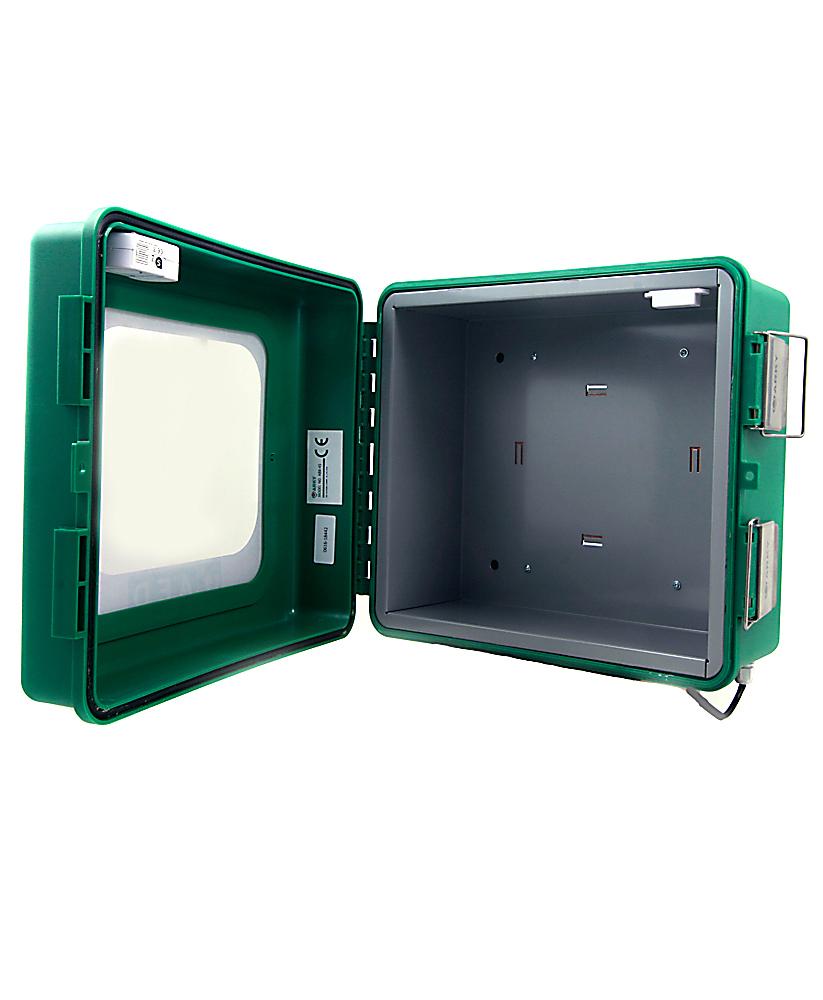 Ulkokaapin pakkaskestävyys -45°C. Kaapin ulkomitat: 40 x 34 x 20 cm. Sisämitat: 32 x 28 x 18 cm. HUOM! Asennukseen tarvitaan sähkömies ja asennuskustannuksista vastaa yhdistys. Muuntaja tulee sijoittaa lämpimään tilaan eli kaappi ulkoseinään ja muuntaja seinän sisäpuolelle tilaan, jossa lämpötila pysyy plussalla.